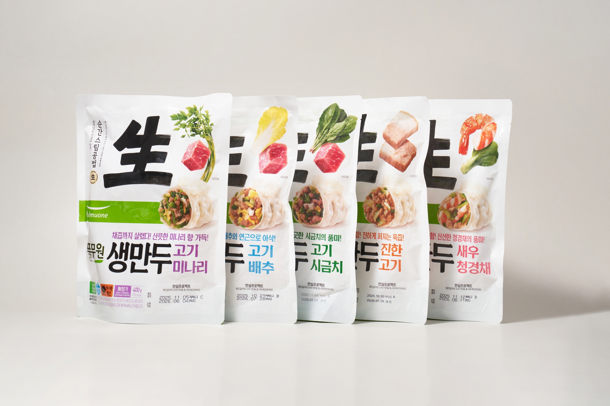 풀무원이 이번에 출시한 생만두는 총 5종이다. 큰 카테고리로는 세 갈래다. 5종 중 3종은 고기+채소 만두소 구성이다. 고기배추, 고기미나리, 고기시금치. 돼지고기의 맛과 잘 어울리는 향이 풍부한 채소라는 공통점이 있다. 아울러 연근을 함께 넣어 씹는 맛을 살렸다는 점도 눈여겨볼 부분이다. 고기의 맛에 더 집중하고 싶은 사람들을 위해 고기만 들어 있는 진한 고기도 있다. 마지막으로 이 안에서도 가장 프리미엄 만두라 할 만한 새우 청경채다. 프리미엄 만두소 재료인 새우와 한국인에게 상대적으로 이국적인 청경채를 가미한 해물+채소 만두소 구성이다.