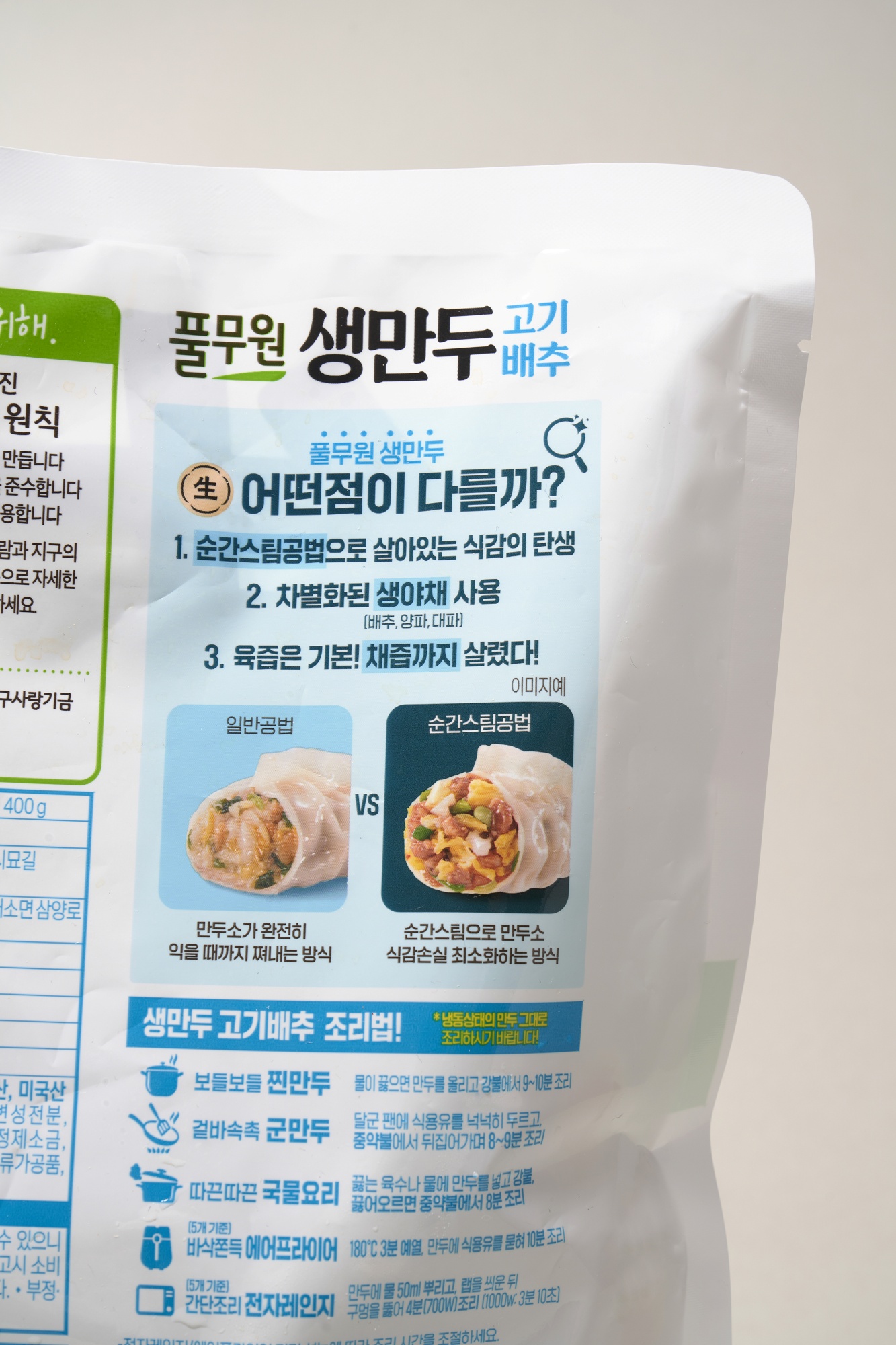생만두가 가진 또 하나의 장점은 폭넓은 조리법이다. 기름을 넉넉히 둘러 군만두로 만들거나 전골이나 라면 등 국물 요리에 넣어도 좋다. 기름을 넉넉히 둘러 구워주다가 녹말 탄 물을 약간 부은 뒤 뚜껑을 닫아서 만두 날개를 만들어주는 교자 전문점 방식으로 먹어도 좋다. 이러면 한 면은 바삭하게 익고, 물을 부어 뚜껑을 닫은 덕에 나머지 만두피와 만두소는 촉촉히 익는 식으로 먹을 수 있다. 물론 간편하게 즐겨도 좋다. 전자레인지와 에어프라이어를 통해서도 생만두의 맛을 느낄 수 있다. 전자레인지에서 조리할 때는 5개(풀무원 생만두 한 봉지 전체 양보다 적다)를 돌리고, 에어프라이어로 조리할 때는 식용유를 조금 발라주는 게 맛의 비결이다.