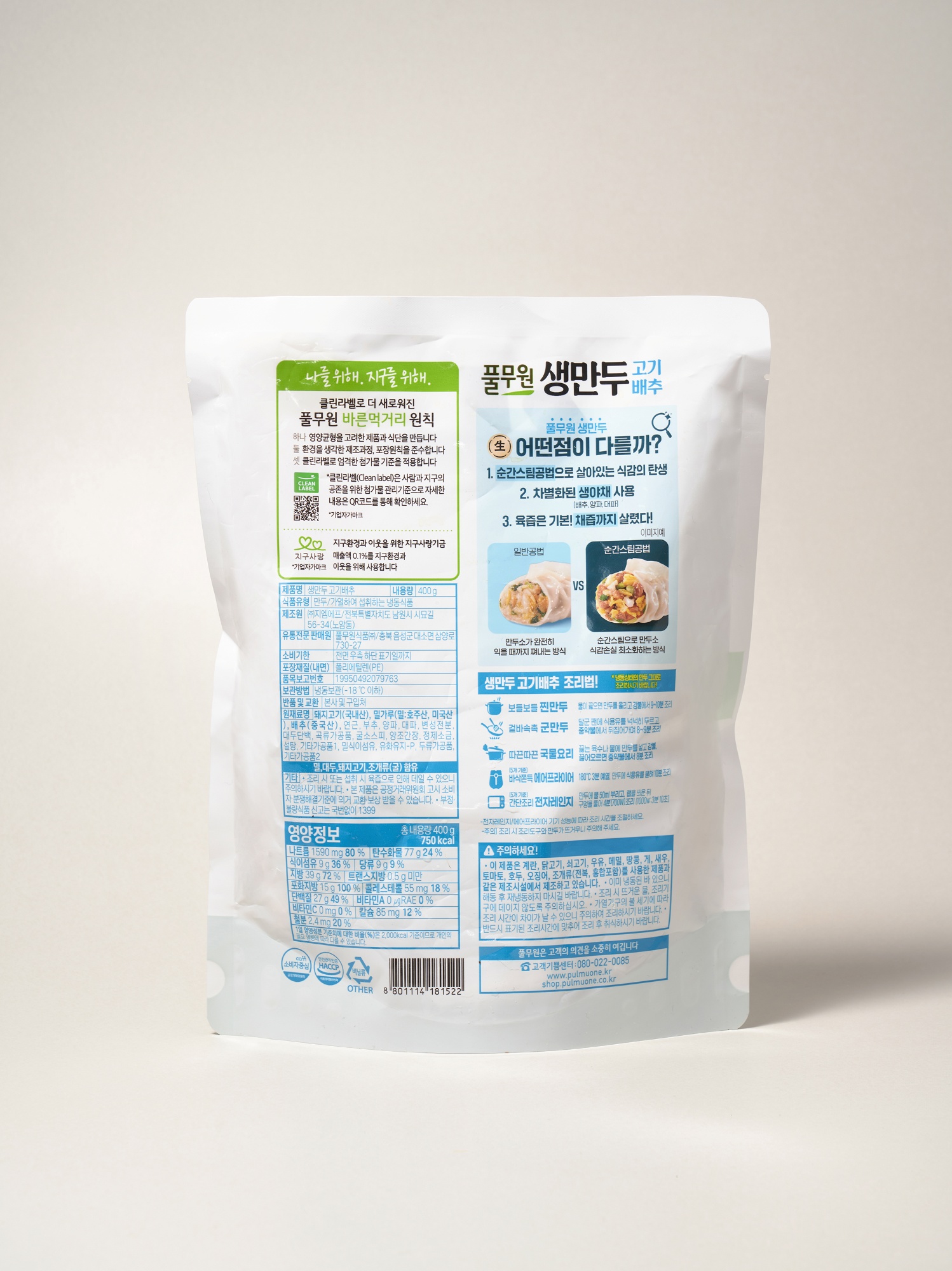 생만두는 이 사이에서 등장한 절충점이자 새로운 업그레이드 만두다. '순간 스팀 공법'을 사용해 만두피는 촉촉하게 유지되게 하는 동시에 만두소의 식감 역시 신선한 상태로 유지되는 두 마리 토끼를 잡았다. 그 덕에 기존 냉동만두에 비해 만두소의 풍미를 더 끌어올릴 수 있다. '채즙'이나 '향', '풍미' 등의 단어로 장점을 강조할 수 있는 비결이다. 생만두는 비슷한 음식 문화를 공유하는 중국 만두시장에서 일반적인 만두이다. 풀무원은 '순간 스팀 공법'이라는 세부적인 컨트롤을 활용해 생만두 제품을 만들었다. 세대가 지날수록 만들기가 어려워지고 결과물이 발전하는 스마트폰이나 아이돌처럼.